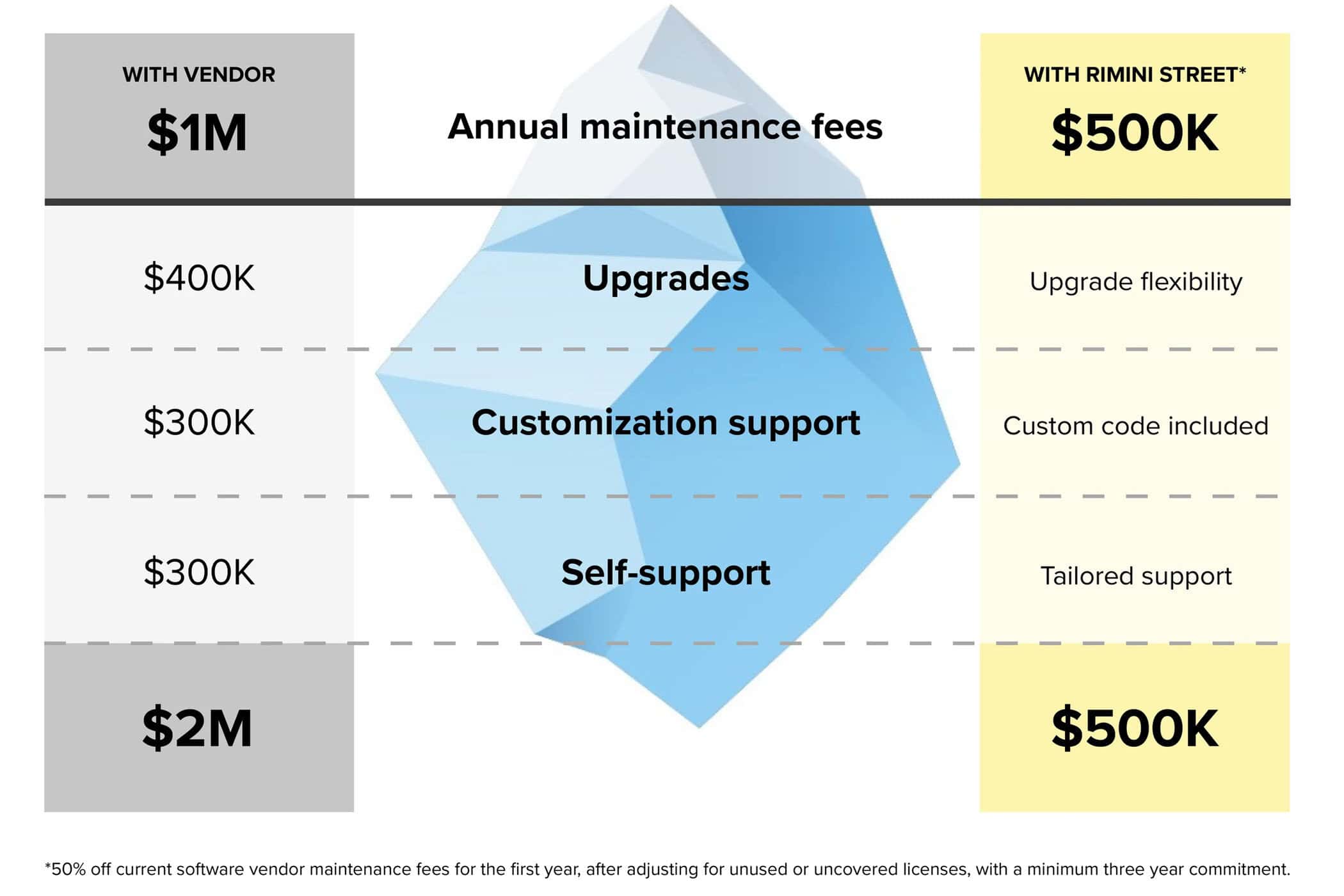 El soporte tradicional de los proveedores representa un costo masivo para aseguradoras e instituciones financieras, limitando la inversión en iniciativas estratégicas. Al migrar a Rimini Support, los clientes pueden mantener soporte completo sobre su software actual hasta por 15 años adicionales a una fracción del costo. Este modelo proporciona ahorros inmediatos de hasta un 50% en tarifas anuales de mantenimiento y hasta 90 % en el costo total de soporte.